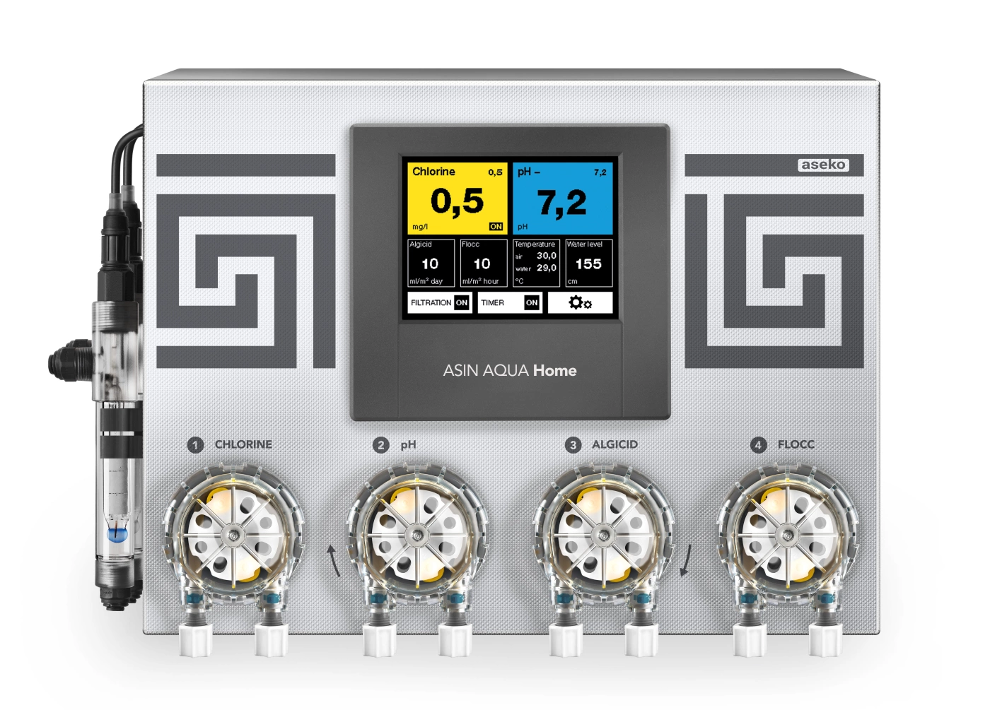 ASIN AQUA Home pH/REDOX VS är en avancerad mät- och doserstation för privata pooler som kombinerar automatisk pH- och Redoxstyrning med teknikfunktioner för hela poolanläggningen.